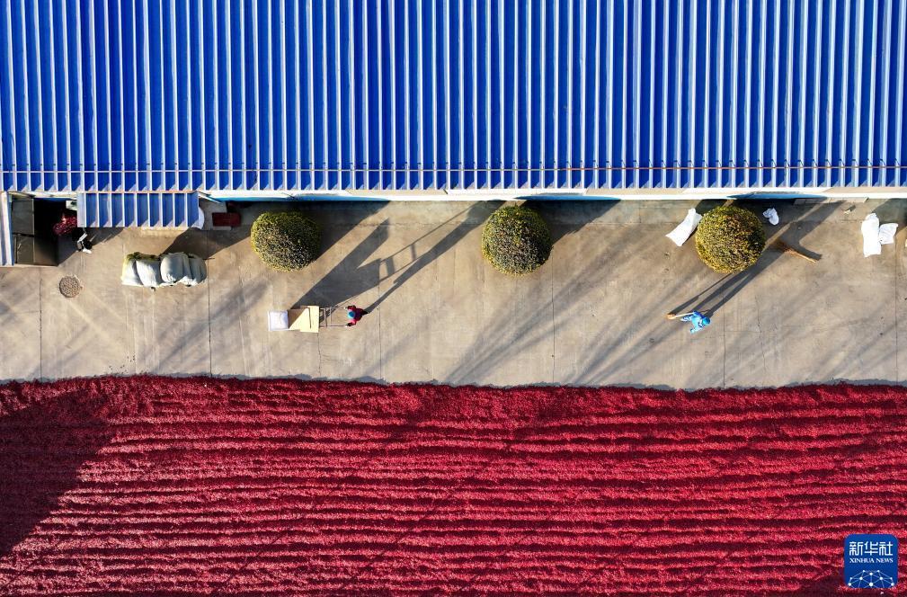 河北省望都县一家辣椒加工企业内晾晒的辣椒(12月1日摄,无人机照片)。