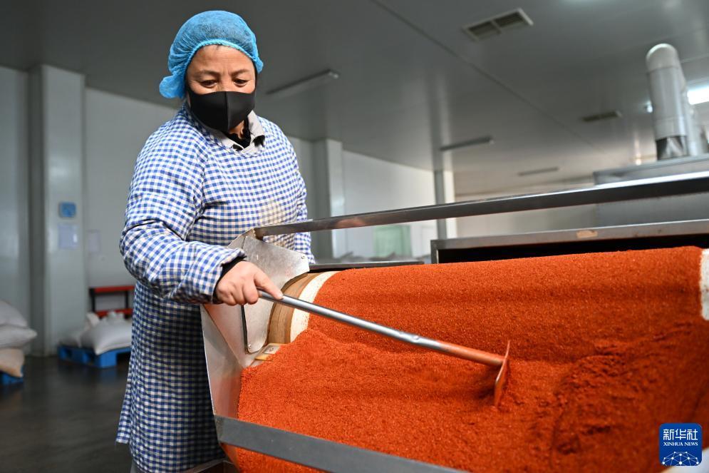 12月1日,河北省望都县一家辣椒加工企业的工人在辣椒面生产线上工作。