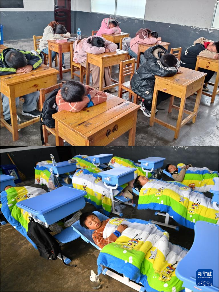 拼版照片:上图为2023年12月28日,在浏阳市龙伏镇黄桥完全小学,六年级学生趴在桌子上午休;下图为2024年1月10日,在浏阳市龙伏镇黄桥完全小学,六年级学生使用可躺式课桌椅午休。