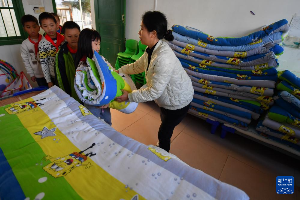 1月10日,在浏阳市龙伏镇黄桥完全小学,三年级学生在午休前排队领取被子。