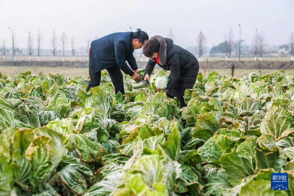 1月10日,在浙江省湖州市织里镇汤溇村的蔬菜种植基地内,种植户采收大白菜。