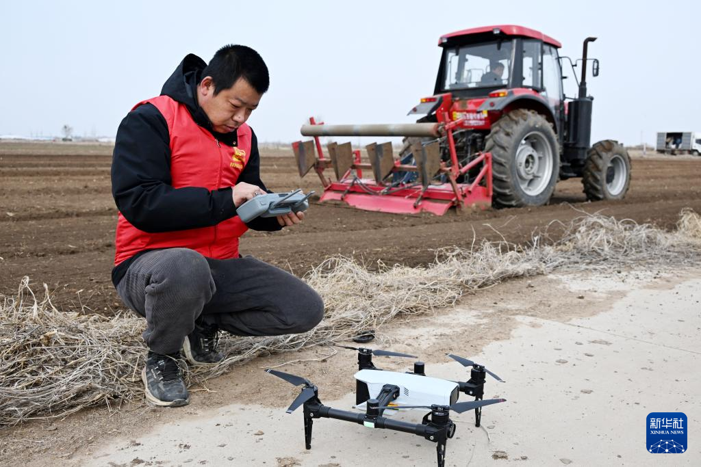 2月29日,农技人员在山东莱西市店埠镇左官屯村调试航测无人机。