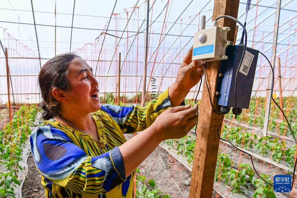 在新疆阿克苏市阿依库勒镇蔬菜基地,种植户检查光照温湿度传感器和农业种植传感器(3月24日摄)。