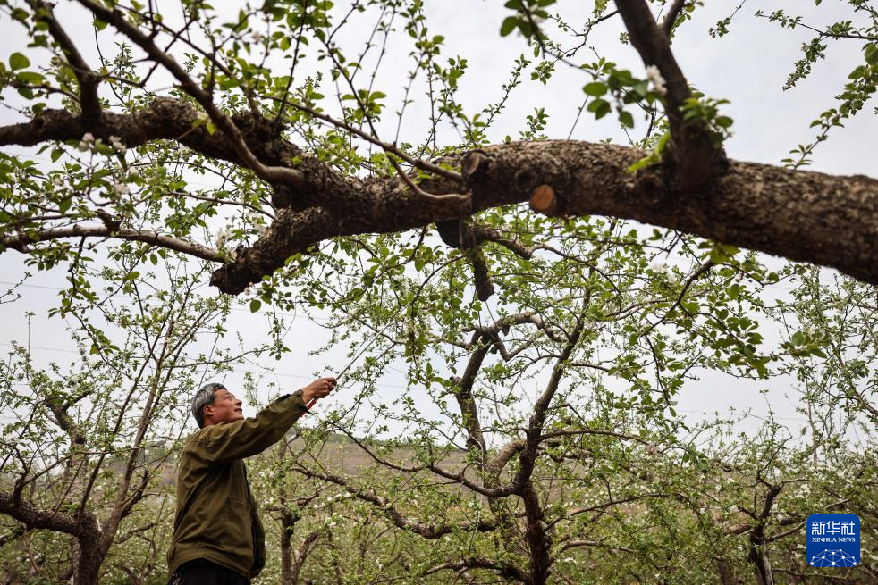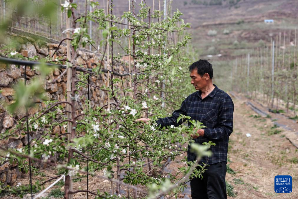 4月10日,果农在西里镇红源新村山地现代栽培园内管护苹果树。