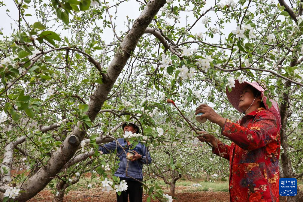 4月10日,沂源县西里镇张家泉村果农吕凤贵在给苹果树授粉。
