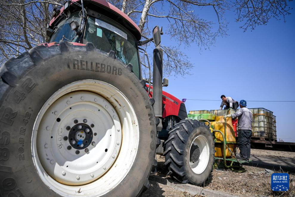 4月11日,在乌兰察布市察哈尔右翼前旗巴音塔拉镇,农机手给农机添加油料。