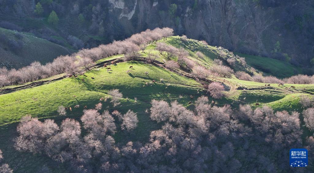 这是4月20日在吐尔根杏花大峡谷拍摄的野杏林,牲畜在山脊上悠闲觅食(无人机照片)。