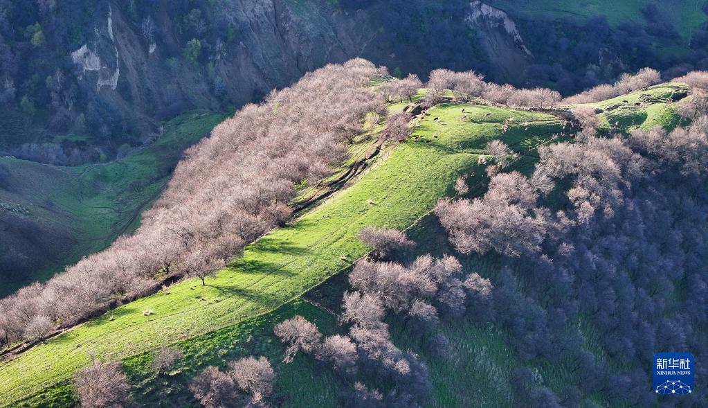 这是4月20日在吐尔根杏花大峡谷拍摄的野杏林(无人机照片)。