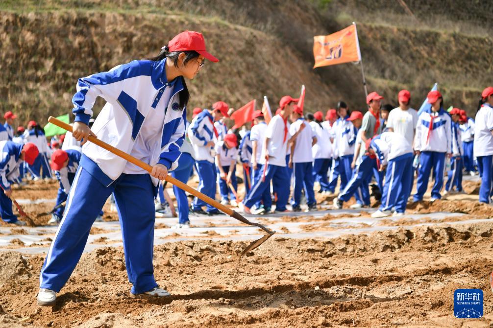 4月15日,来自陕西省安康市的中学生在位于南沟村的全国大中小学劳动教育综合实践(延安)基地进行农业研学。 新华社记者 张博文 摄