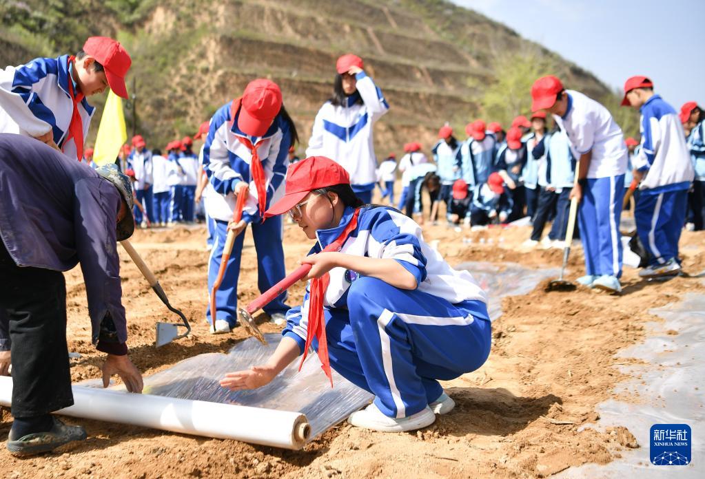 4月15日,来自陕西省安康市的中学生在位于南沟村的全国大中小学劳动教育综合实践(延安)基地进行农业研学。 新华社记者 张博文 摄