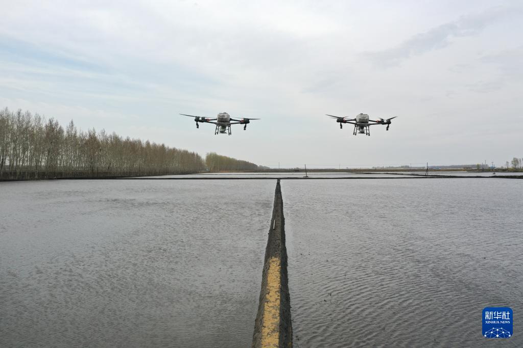 4月24日,在黑龙江北大荒农业股份有限公司友谊分公司第九管理区一处水田,无人机在进行施肥作业。无人机水田施肥作业不受地形环境、作物高度影响,每天施肥作业量可达400至600亩,作业效率是人工的30倍(无人机照片)。