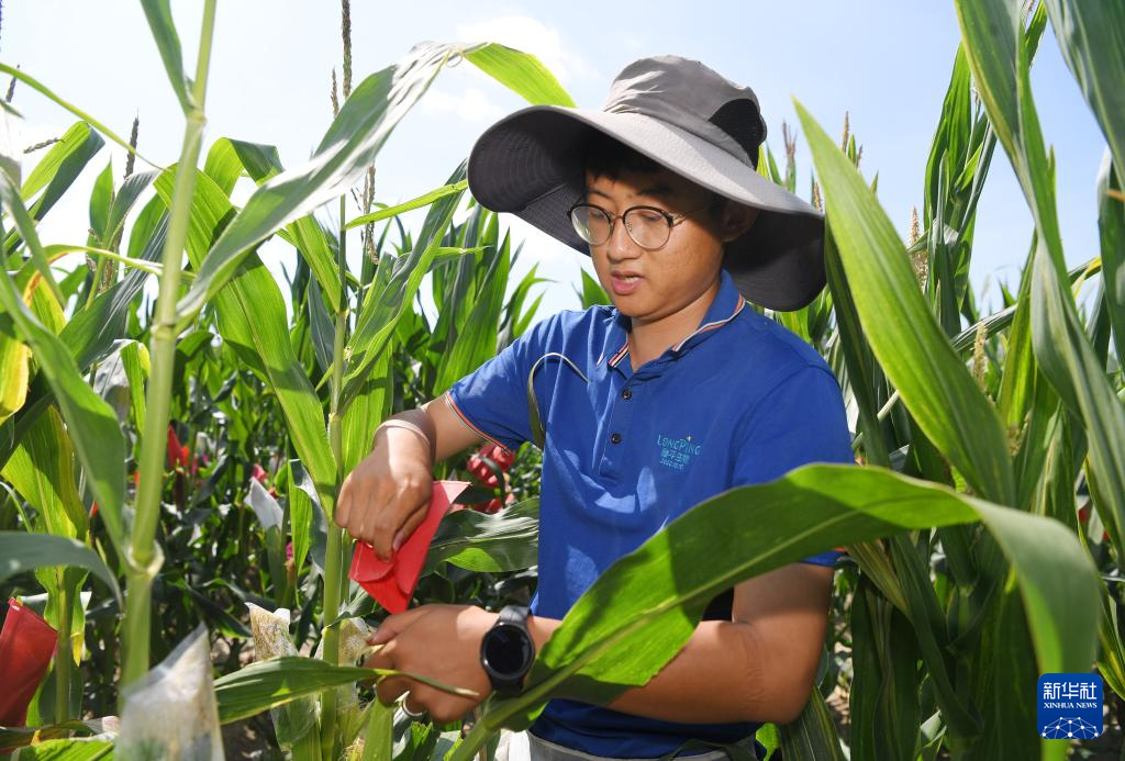2月10日,在三亚市崖州湾科技城,隆平生物技术(海南)有限公司的科研人员对玉米进行自交授粉。