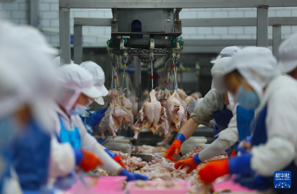 3月11日,在鞍山市九股河食品有限责任公司,工人在车间加工处理鸡肉。