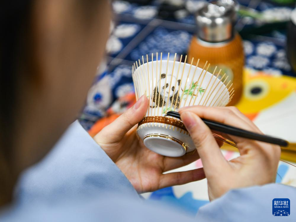 白梓忆在编制“熊猫抱竹”盖碗茶杯(3月7日摄)。