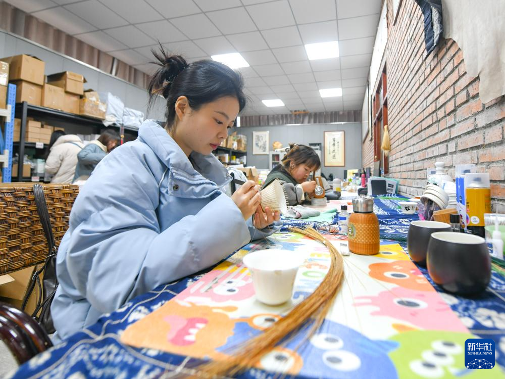 白梓忆(前)在编制“熊猫抱竹”盖碗茶杯(3月7日摄)。
