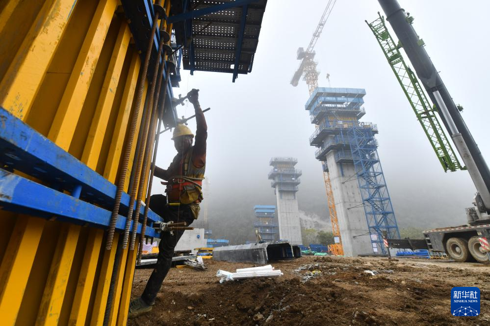 中铁二十局的工人在柳州市柳江区三都镇鱼宜高速公路建设工地作业(3月14日摄)。