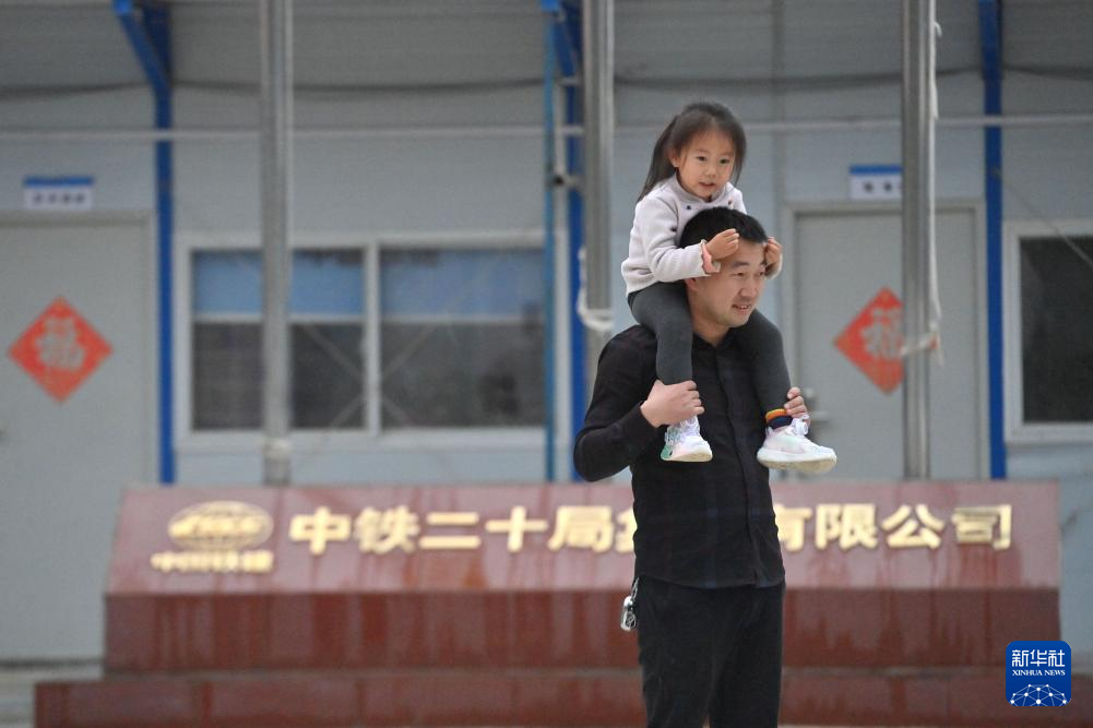 在柳州市柳江区三都镇鱼宜高速公路建设工地,中铁二十局工人陈公兴和女儿在一起玩耍(1月22日摄)。