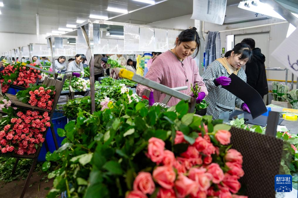 3月16日,花农在姚安毅云花卉有限公司分拣包装车间内包装鲜花。