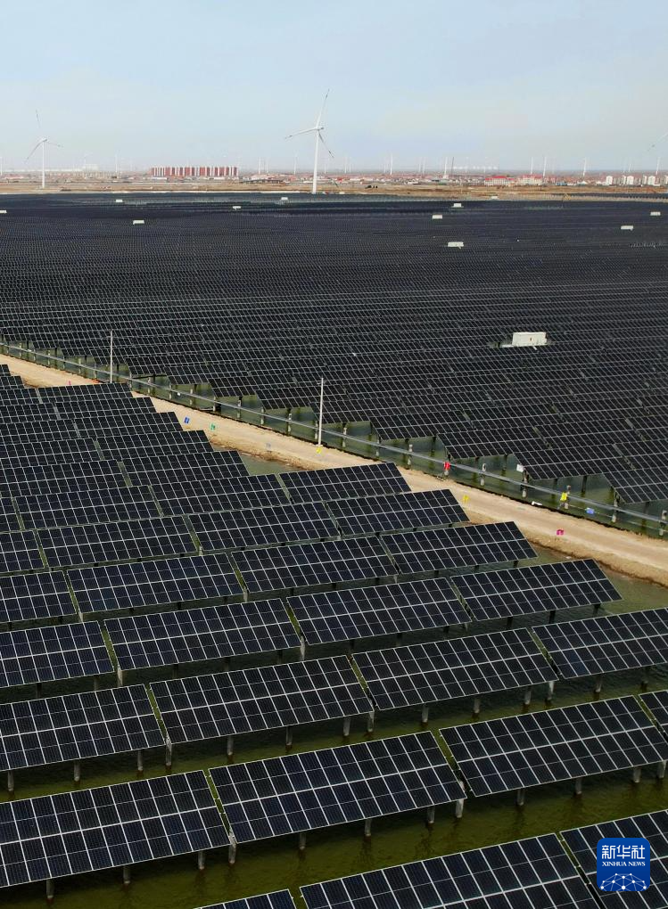 3月29日拍摄的国网沧州供电公司辖区南排河镇一处“渔光互补”光伏发电场和风电场(无人机照片)。
