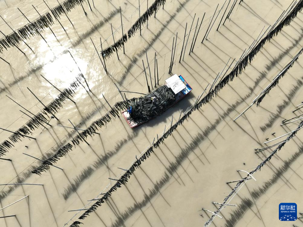 4月15日,福建省霞浦县沙江镇海域海带养殖户在收获晾晒后的海带(无人机照片)。