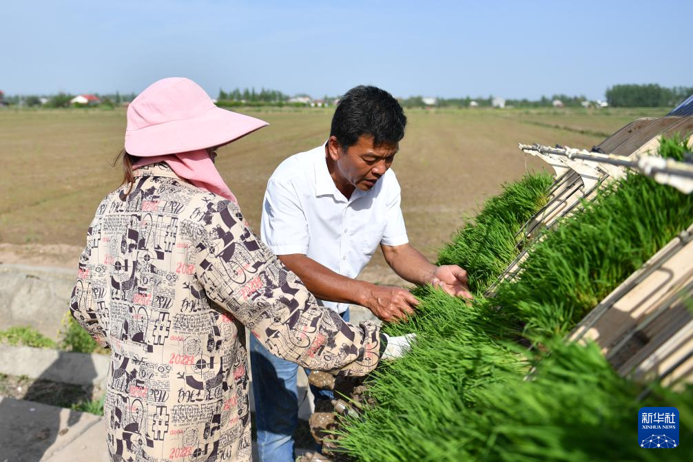 4月15日,邱国清(右)在大通湖区河坝镇王家湖村检查秧苗。