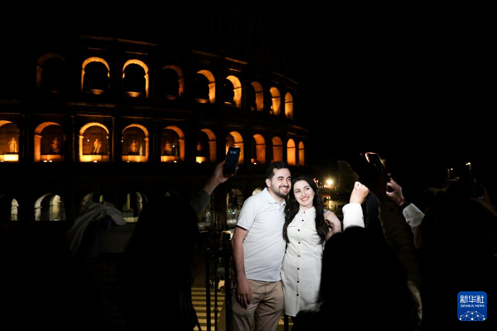 4月19日,一对情侣在意大利罗马的斗兽场前留影。