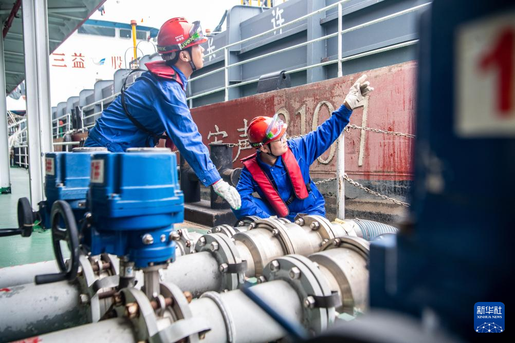 4月22日,在中国石化集团重庆川维化工有限公司物流码头,工作人员将出口的精甲酯等绿色精细化工产品装船。