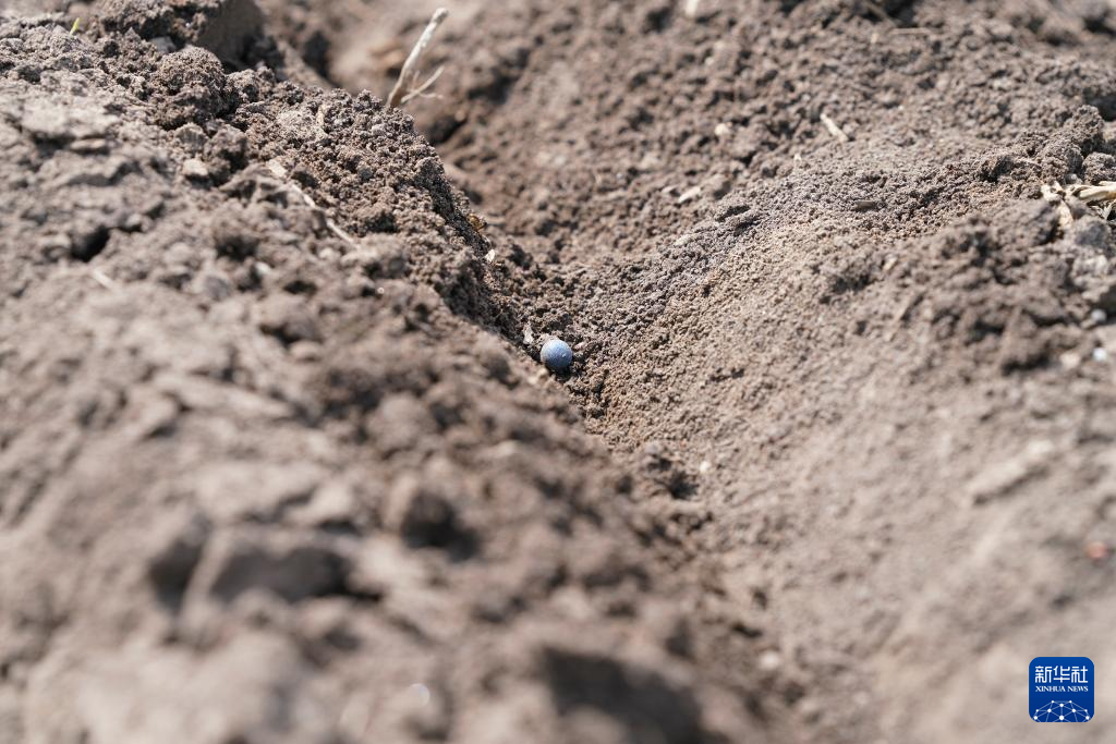 5月8日在位于双鸭山市的黑龙江北大荒农业股份有限公司友谊分公司一旱田地块拍摄的播进土地的大豆种子。