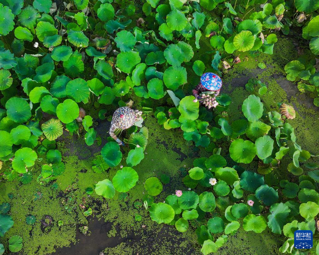 6月18日,武义县柳城镇十里荷花共富工坊的农户在采摘荷花(无人机照片)。