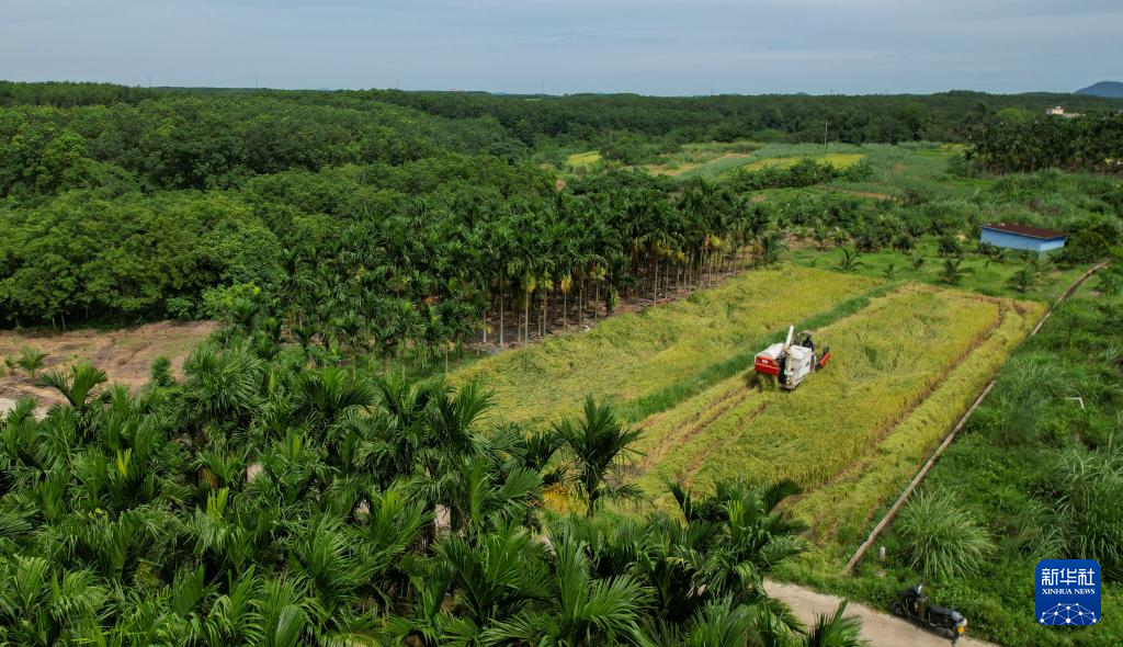 6月18日,在海南省白沙黎族自治县邦溪镇大米村,工人操作收割机收获早稻(无人机照片)。