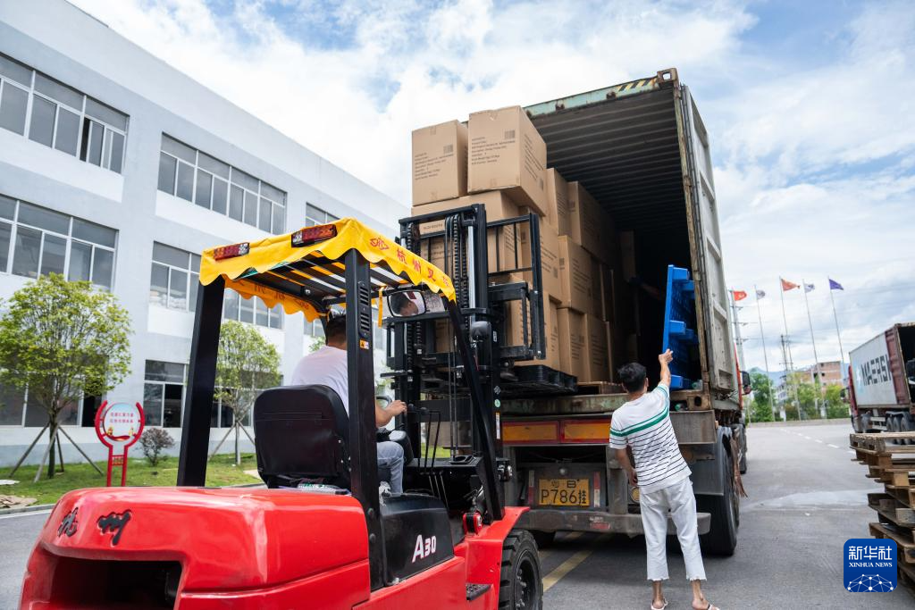 6月23日,在蓝山县皮具箱包科技产业园一家箱包生产企业,工人把成品箱包装车外运。
