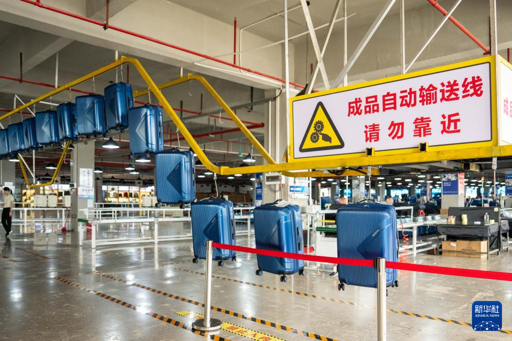 6月23日,在蓝山县皮具箱包科技产业园一家箱包生产企业,自动输送线在运输拉杆行李箱成品。