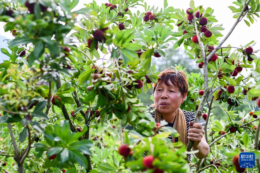 6月23日,农户在浙江省文成县环飞云湖杨梅基地采摘东魁杨梅。