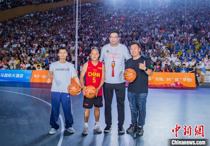图为中国篮球名宿胡卫东(右二)与球迷互动。黄灿宪 摄