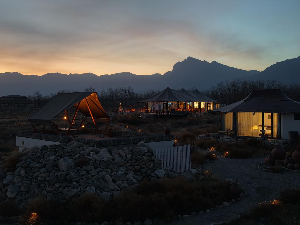 夜幕降临,在位于夏木酒庄的游牧营地里,篝火晚会刚刚开始。“赤霞珠”“霞多丽”“马瑟兰”……几座以葡萄品种命名的帐篷客房里亮着微光,人们围坐在火堆旁,举杯相庆,一边品味葡萄酒圆润甘甜的口感,一边欣赏浩瀚璀璨的星空。
