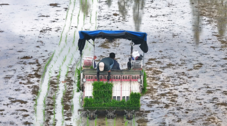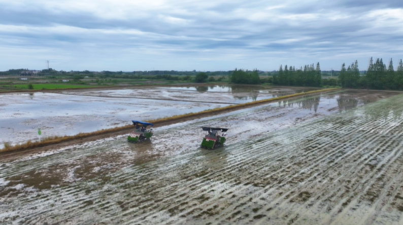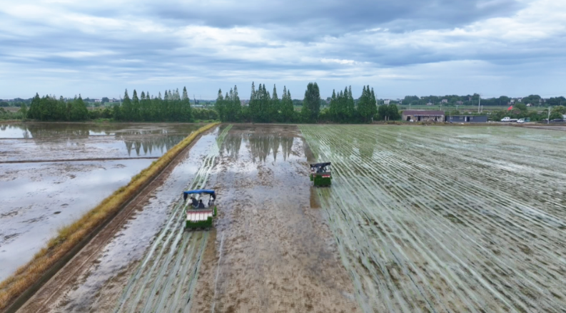 在安徽省郎溪县的田间地头,多台插秧机开足马力、来回穿梭。