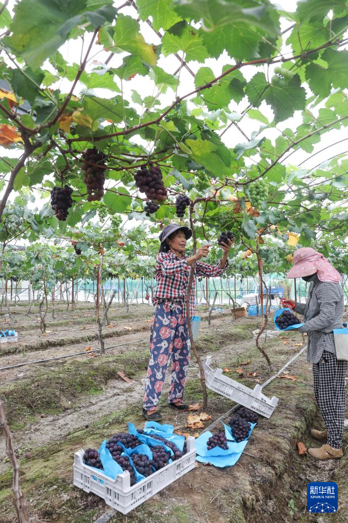 6月25日,种植户在慈溪市坎墩街道农创园的慈溪市瑞辉果蔬农场大棚内采收葡萄。