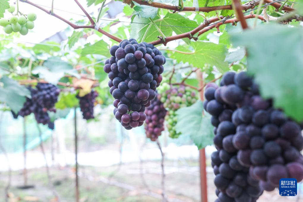 慈溪市坎墩街道农创园的慈溪市瑞辉果蔬农场大棚内,成熟的葡萄挂满枝头(6月25日摄)。