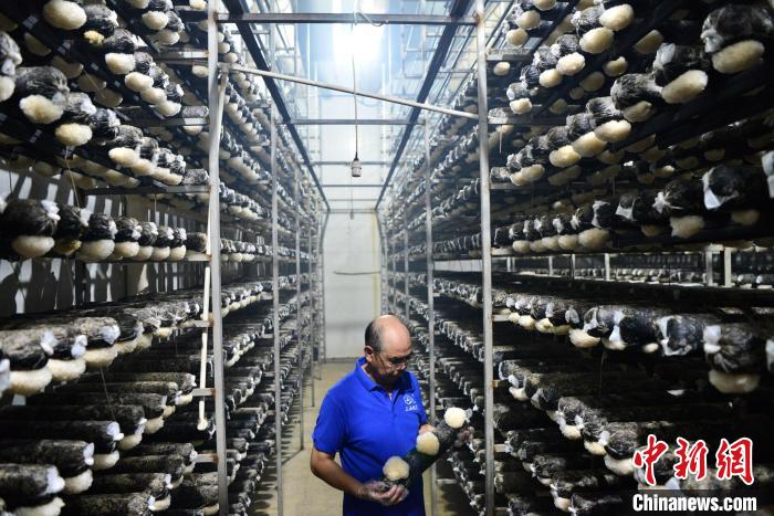 6月26日,在古田县一家食用菌生产企业的无公害银耳基地内,工人在查看银耳长势。中新社记者 张斌 摄