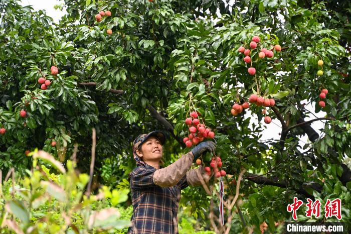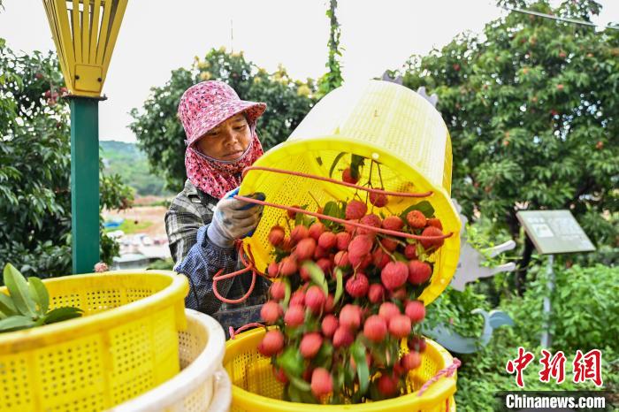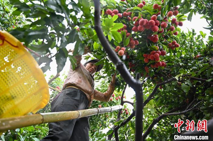 6月26日,果场工作人员采摘“仙进奉”荔枝。中新社记者 陈骥旻 摄
