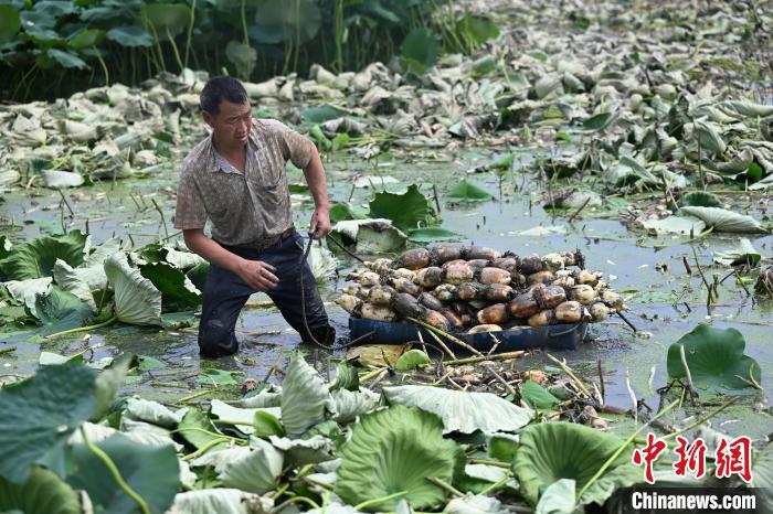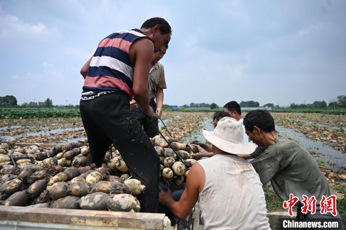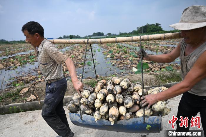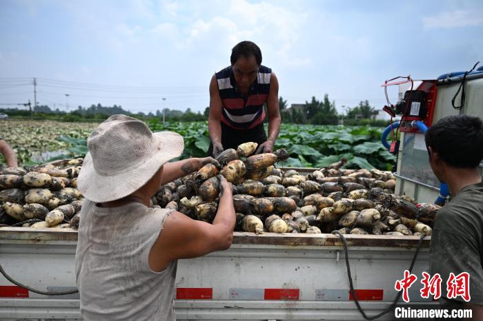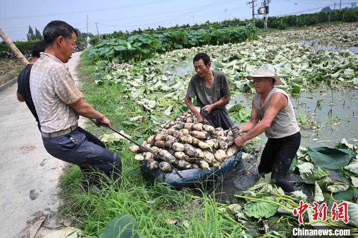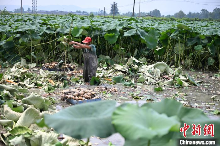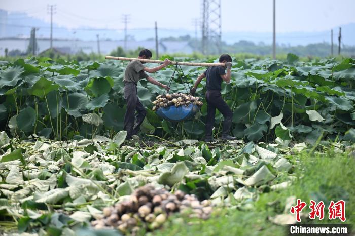 6月26日,在四川省成都市新津区安西镇,村民忙着采挖莲藕供应市场。中新社记者 张浪 摄