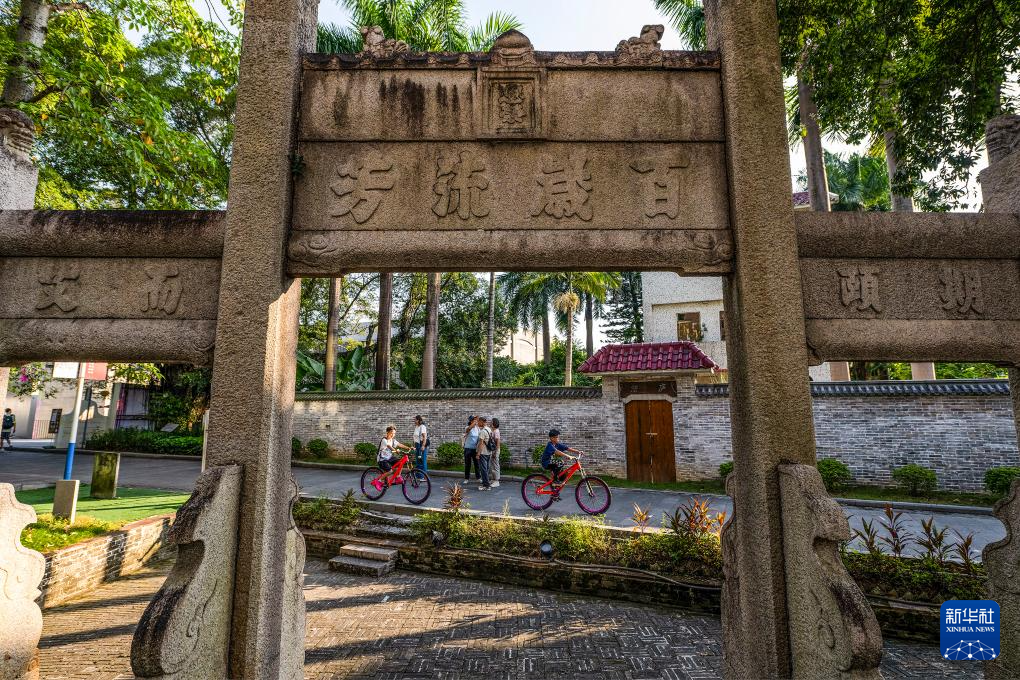 9月13日,孩子们骑车经过塱头村的升平人瑞牌坊。远处白色建筑是春阳台艺文中心。
