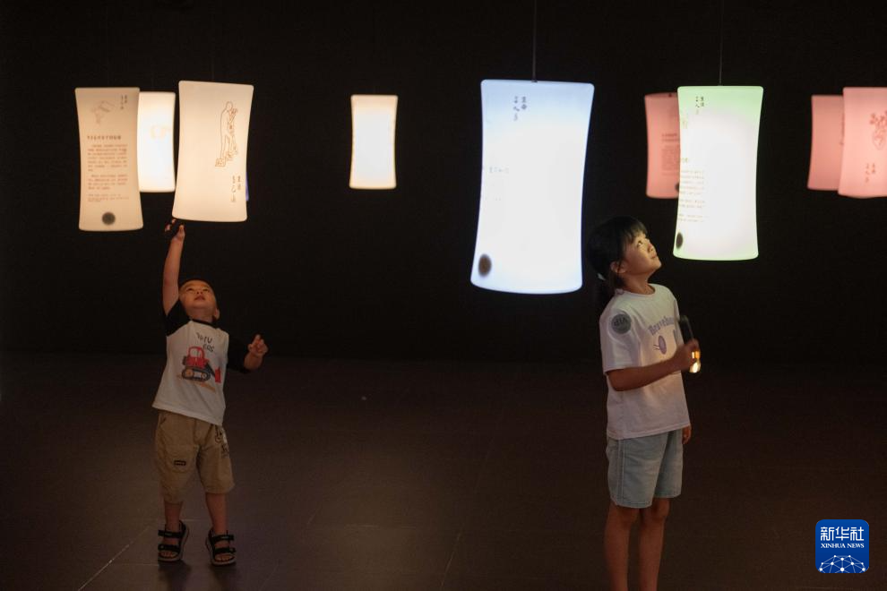 9月13日,孩子们在塱头村春阳台艺文中心的展览中体验一个空间互动装置。