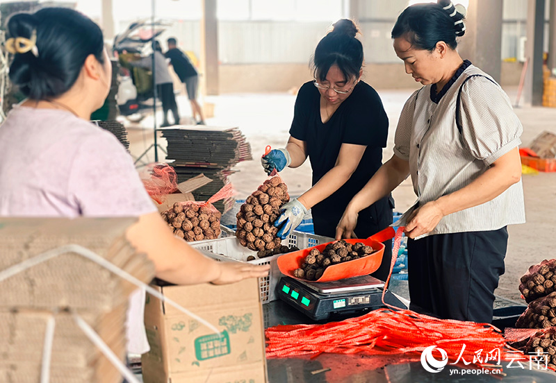 工作人员正在为核桃称重、打包。人民网 尹馨摄