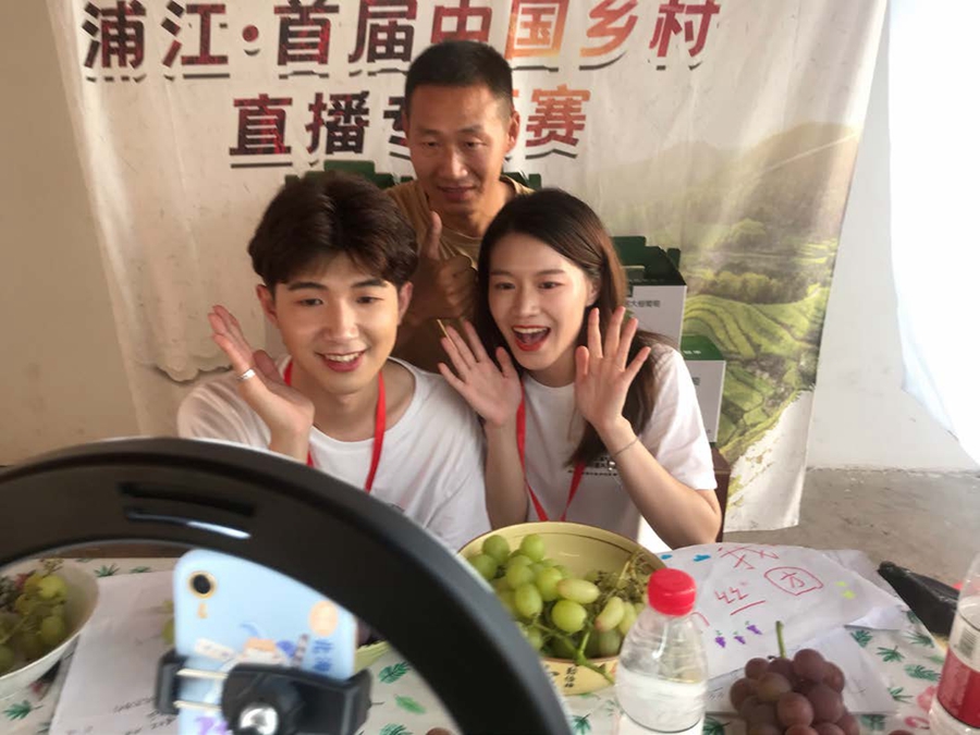 图为全国大学生乡村振兴大赛金华市浦江县专项赛参赛者。大学生们与浦江当地农民一起组成团队,手把手教会农民直播带货,用镜头记录浦江元素、传播浦江文化,以直播的形式服务浦江乡村振兴。