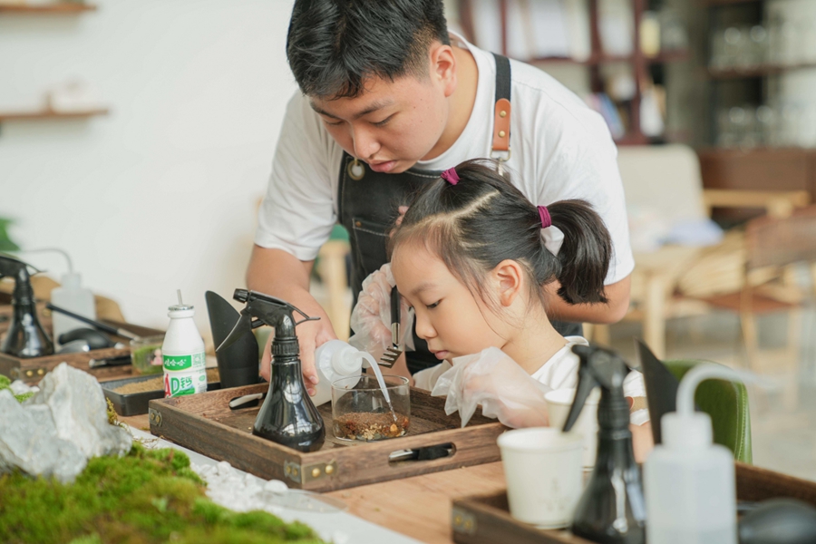 图为三明学院学生董邱华(左)指导小朋友制作苔藓微景观。