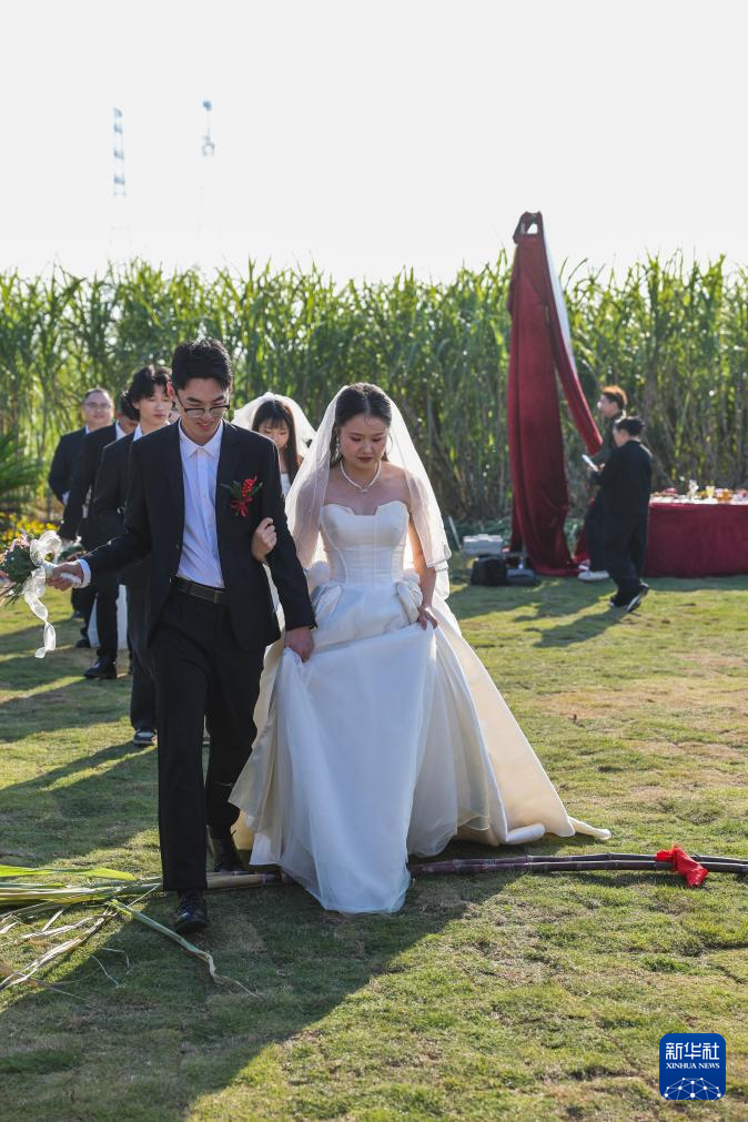 11月23日,新人在集体婚礼中进行跨百年蔗环节,寓意甜甜蜜蜜。甘蔗种植和古法红糖制作是丰江周村的特色产业,本次集体婚礼也融入了特色产业的元素。