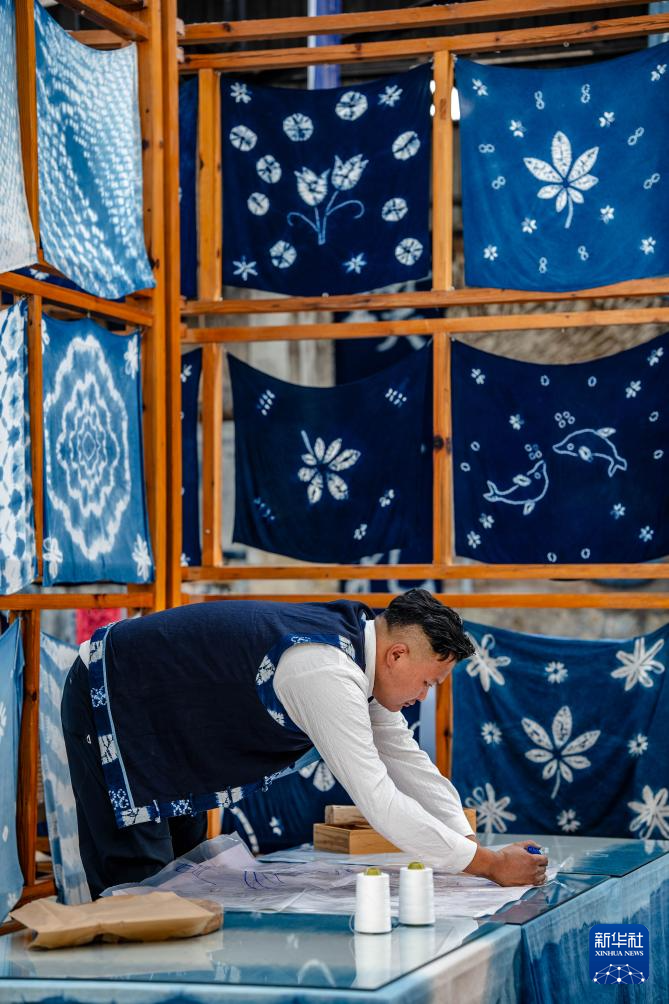 白族扎染技艺传承人段袁在周城村“璞真染坊”绘制扎染图案(11月21日摄)。