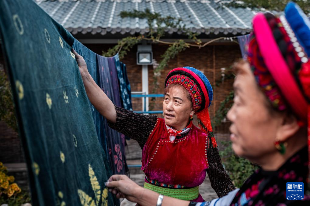 白族扎染技艺传承人段银妹(左)和手工艺人段利兰在周城村“璞真染坊”晾晒扎染成品(11月21日摄)。