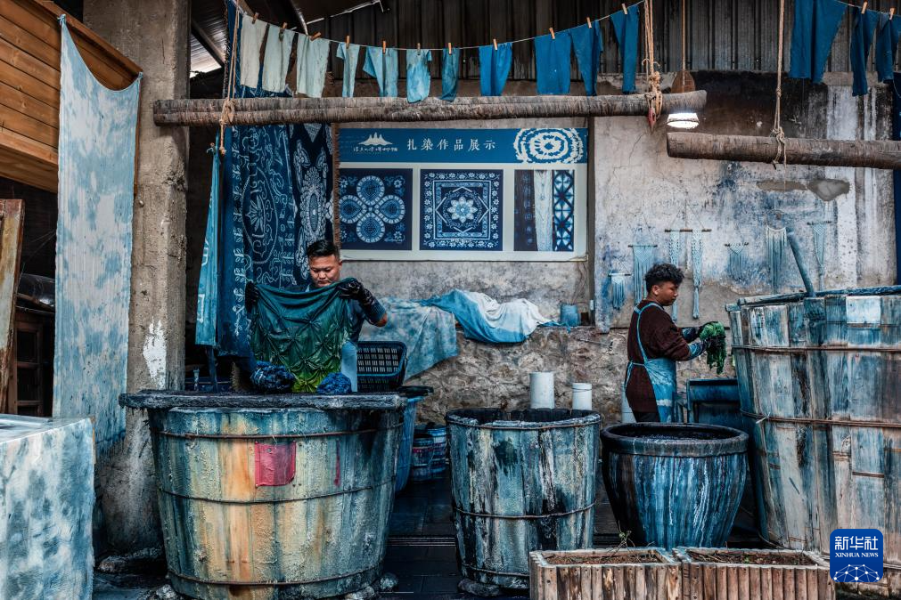 白族扎染技艺传承人段袁(左)在周城村“璞真染坊”将缝扎好的布料放入染缸内浸染(11月21日摄)。